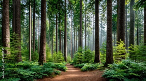 © FarhaStock, Naklejka premium Serene Path Through Lush Evergreen Forest Sunlight Dappled Trail Amongst Tall Trees