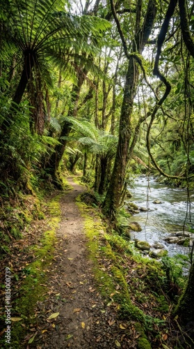 Obraz premium Serene Path Through Lush Green Forest by Tranquil Stream