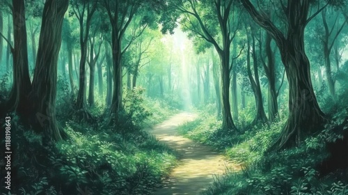 © Penatic Studio, Obraz premium Serene Path Through Lush Green Forest Canopy