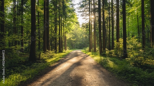 © Pojjanee, Obraz premium Serene Path Through Lush Green Forest Landscape