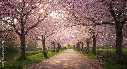 Naklejka premium Serene pathway lined with blooming cherry trees in a city park landscape