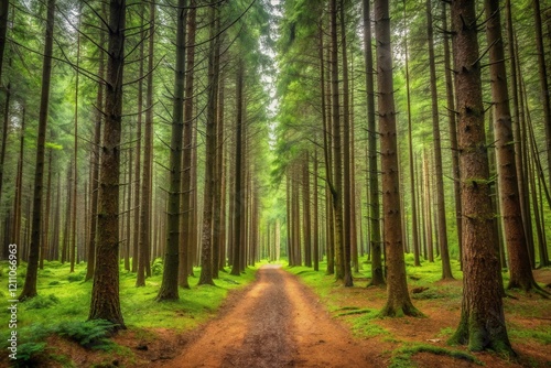 Naklejka premium Serene Pathway Through a Lush Evergreen Forest, Sunlight Filtering Through Dense Canopy, Creating a Tranquil and Picturesque Scene