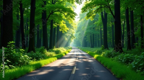 © yut, Obraz premium Serene Pathway Through a Lush Forest Canopy with Sunbeams Illuminating the Road Ahead
