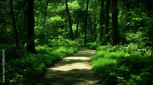 Fototapeta premium Serene Pathway Through a Lush Green Forest Under Sunlight in Nature