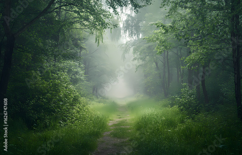 © city of pictures, Obraz premium Serene Pathway Through a Lush, Misty Forest A Journey into Nature's Embrace