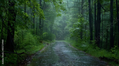 © Ratchadaporn, Obraz premium Serene Pathway Through a Lush Rain Soaked Forest Landscape