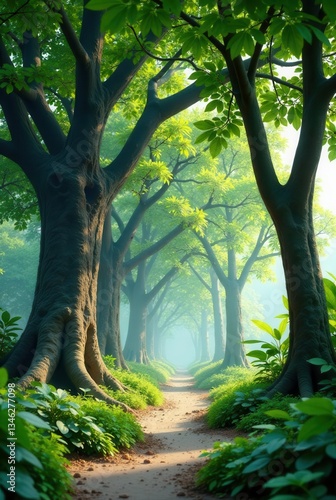 © Angel Pic, Naklejka premium Serene Pathway Through a Lush, Sun-Dappled Canopy of Ancient Trees