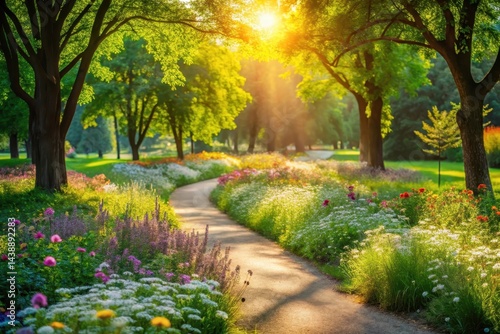 Naklejka premium Serene Pathway Through a Sunlit Garden of Blooming Flowers and Lush Greenery