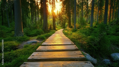 © Noppakun, Obraz premium Serene Pathway Through a Tranquil Pine Forest