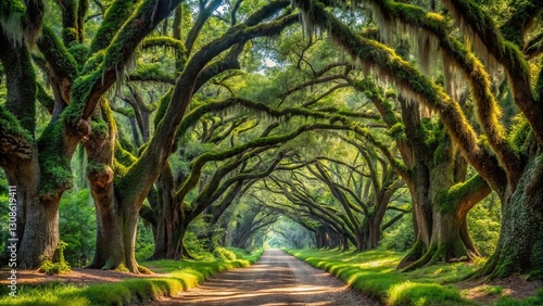 Fototapeta premium Serene Pathway Through Ancient Moss-Draped Trees, A Sun-Dappled Driveway...
