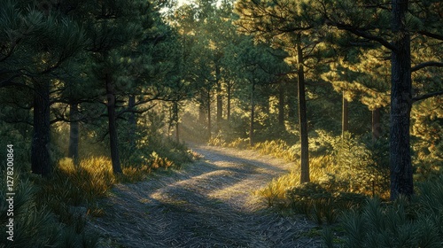 © Kitta Studio, Naklejka premium Serene Pathway Through Dense Forest with Sunlight Filtering Through Trees
