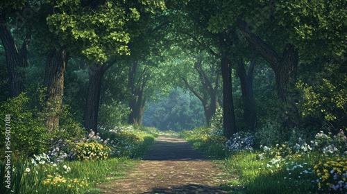 © Piyawat, Obraz premium Serene Pathway Through Enchanted Forest Sunlight Filtering Through Trees Flowers Lining Path