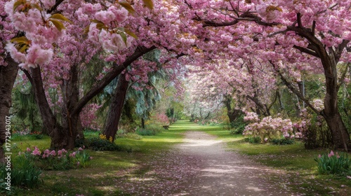 Naklejka premium Serene Pathway through Lush Cherry Blossom Trees Creating a Dreamy Spring Landscape with Soft Pink Petals and Vibrant Green Grass