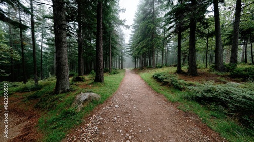Obraz premium Serene Pathway Through Lush Green Forest Surrounded by Misty Atmosphere and...