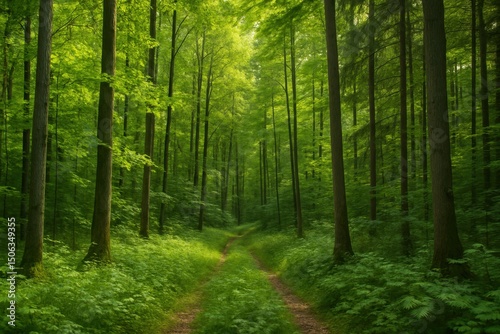 Fototapeta premium Serene Pathway Through Lush Green Forest Surrounded by Tall Trees and Vibrant Foliage in Tranquil Nature Setting