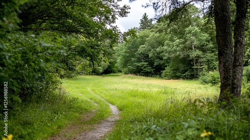 Fototapeta premium Serene pathway through lush green trees and grass leading to a tranquil...