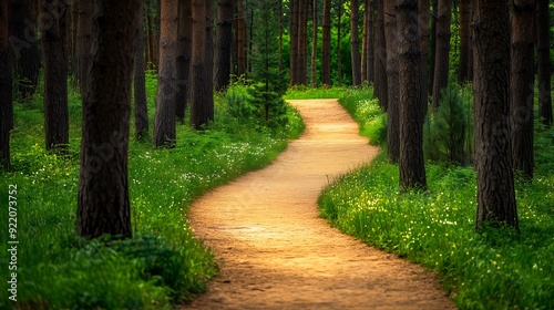 © xxom.o, Obraz premium Serene Pathway Through Pine Forest in a Tranquil Nature Setting