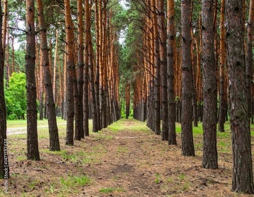 © Tuachan, Obraz premium Serene Pathway Through Tall Pine Trees in Lush Green Forest