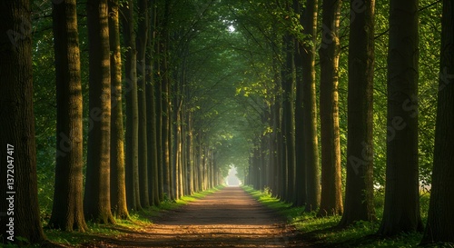 Naklejka premium Serene pathway through tall trees in a vibrant green forest setting