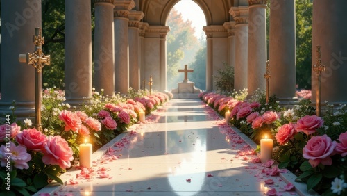 © Nova, Fototapeta premium Serene Pathway to Tranquility Sunlit Colonnade with Pink Roses and Lit Candles Leading to a Simple Cross