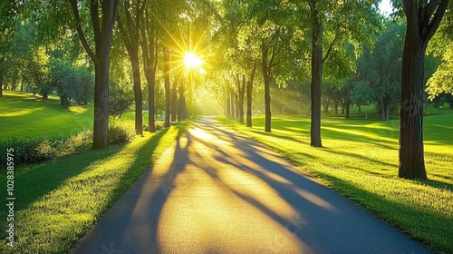 © somsri, Obraz premium Serene Pathway Under Sunlit Green Canopy