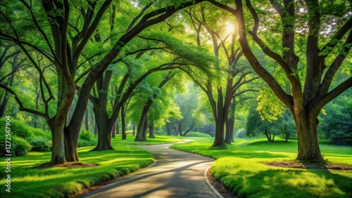 Fototapeta premium Serene Pathway Winding Through a Lush Green Canopy of Majestic Trees on a Sunny Day