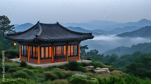 © Darul, Obraz premium Serene Pavilion Perched Atop Misty Mountain Range