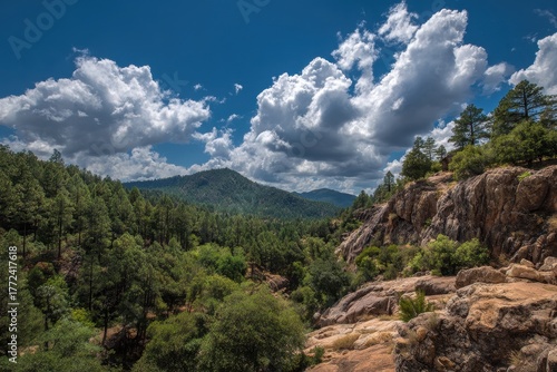 Fototapeta premium Serene Payson AZ Landscape: Majestic Mountains Under a Blue Sky Surrounded by Lush Forests and Gentle Clouds