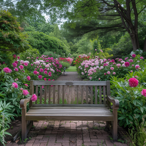Fototapeta premium Serene Peony Garden with Welcoming Bench Pathway