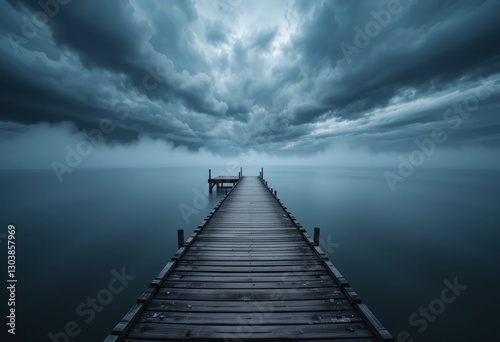 © Mehdi, Naklejka premium Serene Pier Scene. Tranquil Ocean View, A Wooden Pier Extends Into Foggy Waters. Overcast Sky Creates A Calm And Moody Atmosphere. Solitude And Contemplation On The Horizon.
