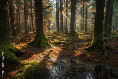 Obraz premium Serene pine forest with stream and sturdy trunks., generative IA