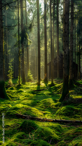 © Adam, Obraz premium Serene Pine Forest with Sunlit Canopy and Secluded Wooden Cabin