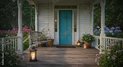 © fotostockuus, Obraz premium Serene Porch with Swing and Flowers.