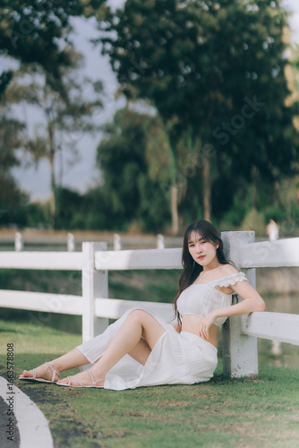 © Kritdanai, Naklejka premium Serene Portrait in the Park: A young woman finds a moment of peace, leaning against a fence in a park, the sunlight gently caressing her.