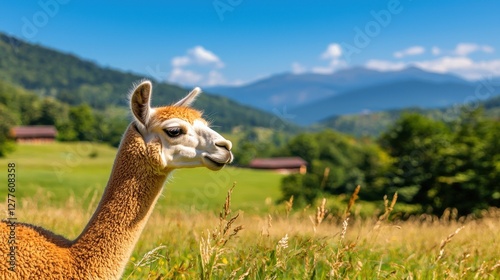 © Nutty, Obraz premium Serene portrait of a llama grazing in a lush meadow against a backdrop of majestic mountains and a clear blue sky