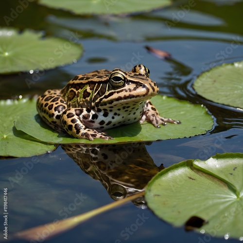 © KAThakshala, Fototapeta premium Serene Portrait of a Relict Leopard Frog Resting on a Lily Pad