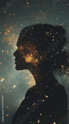 © vadosloginov, Fototapeta premium Serene portrait of a woman enveloped in a cosmic glow against a dark background