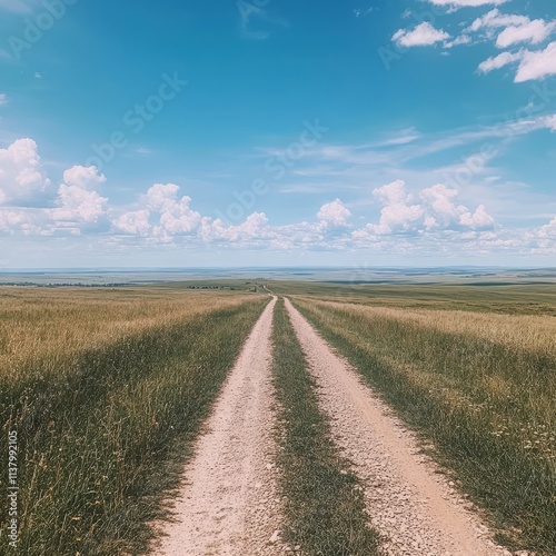 © Big9869, Obraz premium Serene Prairie Path A Journey Across Endless Grasslands Under a Summer Sky