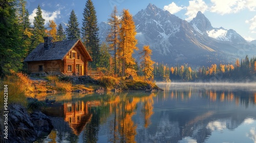 © Aventurine, Fototapeta premium Serene, pristine mountain lake, mirrored reflection, high quality, photorealistic, tranquil, idyllic, scenic, panoramic, breathtaking::0.9 wooden cabin, hiking trail, canoeing, fishing, snow-capped