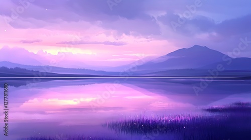 © MASJAB, Fototapeta premium Serene Purple Sunset Over Tranquil Mountain Lake