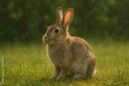 © Eing, Fototapeta premium Serene rabbit sits gracefully in sunlit meadow, surrounded by lush green grass. Its soft fur glistens in warm light, creating peaceful and charming scene