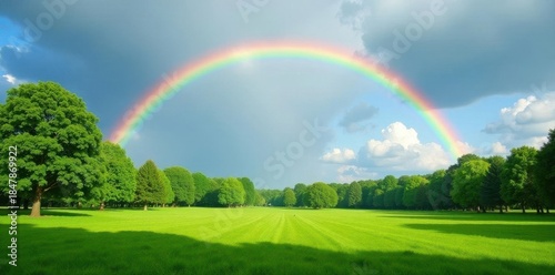 Naklejka premium Serene rainbow arc over lush green parkland, tranquil sky , countryside, park