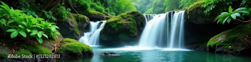 Fototapeta premium Serene rainforest waterfall cascading over moss-covered rocks , rainforest,...