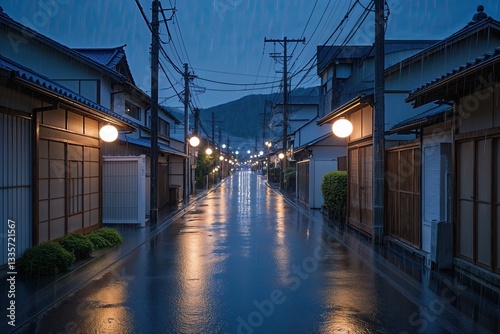 © Michael, Fototapeta premium Serene Rainy Evening on Twinkling Dusk Lane in Japanese Urban Setting