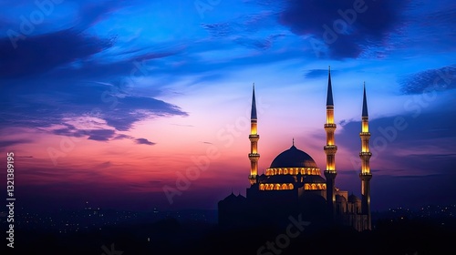 © Barra Fire, Obraz premium Serene Ramadan dusk with golden minarets against a deep blue sky