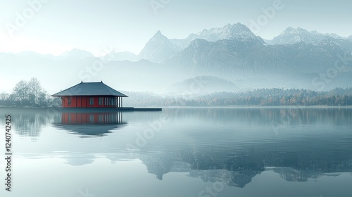 Fototapeta premium Serene red pavilion lake mountain mist calm