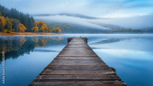 Fototapeta premium Serene reflection a tranquil wooden dock nestled amidst misty autumn...