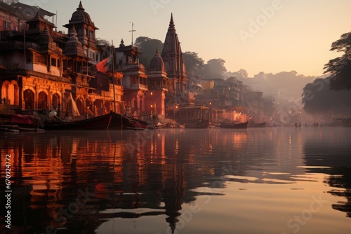 © Shooting Star Std, Obraz premium Serene reflection in the Ganges River at sunrise, Generative AI