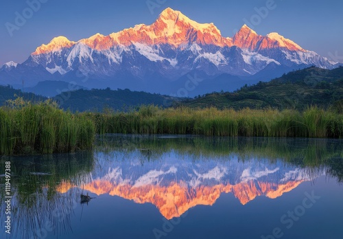 Fototapeta premium Serene Reflection of Majestic Snow-Capped Peaks at Dawn, Glowing in Warm Sunrise Colors with Lush Greenery and Tranquil Water Below