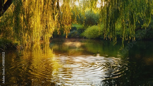 © Kitta Studio, Fototapeta premium Serene Reflection on Calm Water Surrounded by Lush Willows